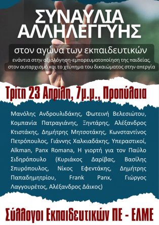 Εκπαιδευτικά νέαΣύλλογος Συναυλία αλληλεγγύης στον αγώνα των εκπαιδευτικών, Τρίτη 23/4, ΠΡΟΠΥΛΑΙΑ, 7.00 μ.μ. 18 Απριλίου 2024